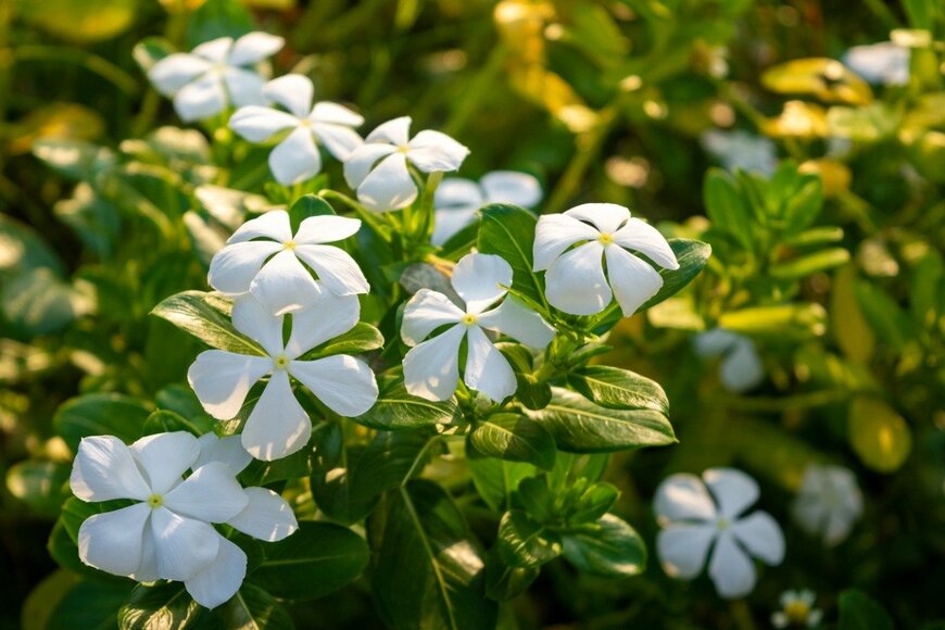 ホワイトの花が咲くニチニチソウと、ブルーの花が咲くエボルブルスの寄せ植えは、配色の美しさが際立つ組み合わせ。新緑の季節にピッタリの爽やかさで、花は秋まで楽しむことができます。