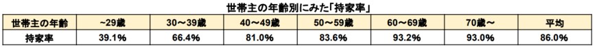 特に、30歳以降に家を購入する世帯が多いです。70歳以降は93%もの世帯が持ち家世帯となっています。