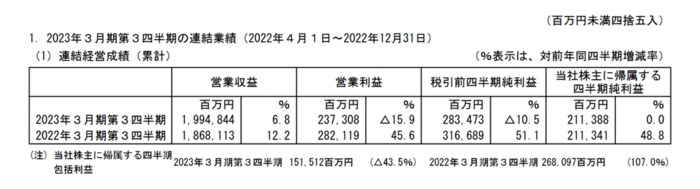 オリックスは「2023年3月期 第3四半期決算短信〔米国基準〕(連結)」を公表しており、2023年3月期第3四半期の連結決算は、営業収益が1兆9948億4400万円(前年同期比6.8%増)、当社株主に帰属する四半期純利益は2113億8800万円(前年同期比0.0%)でした。
