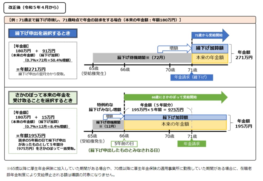 66歳時点(71歳-5歳)で繰下げ申出したものとみなすため、年間の年金額は195万円(180万円×108.4%)に増額します。