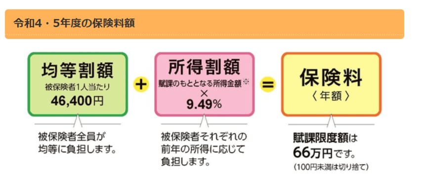 後期高齢者医療制度の保険料は都道府県によって異なります。例えば東京都の場合、均等割額4万6400円+所得割率9.49%の合計が保険料となります。