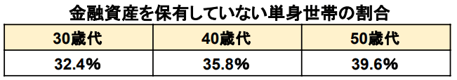 金融広報中央委員会「家計の金融行動に関する世論調査【単身世帯調査】(令和4年)」によると、30〜50歳代で金融資産を保有していない単身世帯の割合は以下のとおりです。