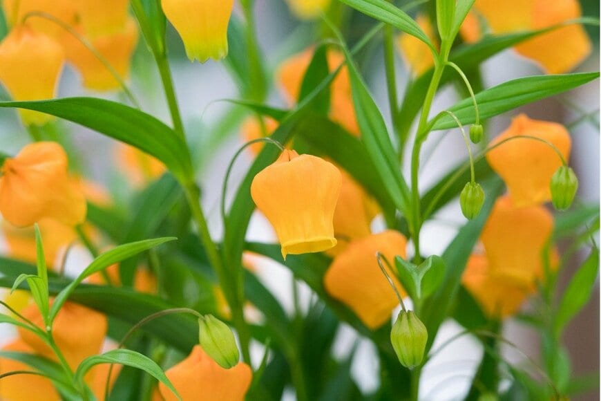 サンダーソニアはオレンジ色のベル型の花を咲かせる多年草。個性的な雰囲気でオシャレな庭のアクセントになります。地植えでも鉢植えでも育てることができますよ。
