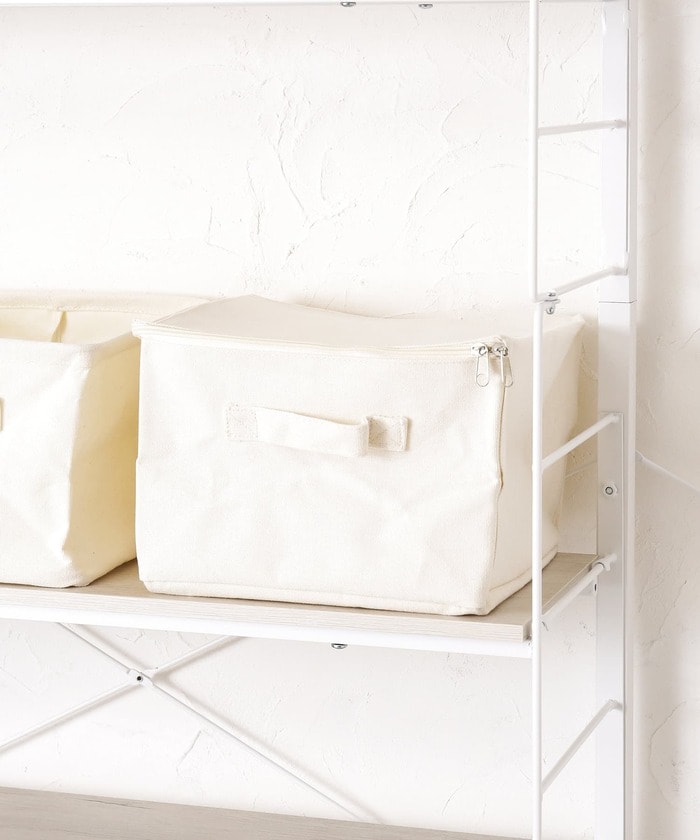 清潔感のあるコットン使用のボックスです。ファスナー付きの蓋は全開にできるので、収納もラクラク。取っ手がついていて、持ち運びにも便利です。洗面所やトイレのラックなどにも置きやすいスクエア型なので、生理用ナプキンなどのサニタリー用品やタオル類の収納にもよいでしょう。