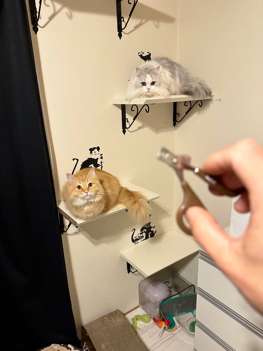 爪切りを持つ飼い主さんを目にした、猫ちゃん達のかわいいリアクションがTwitterに投稿され注目を集めています。
