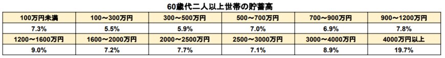 貯蓄4000万円以上の世帯が19.7%も存在します。60歳代二人以上世帯の5世帯に1世帯が4000万円以上の貯蓄を持っていることになります。