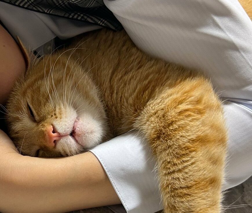 話題になっているのは元保護猫のリチャードくん、この日のリチャードくんは、完全に熟睡モードのようです。飼い主さんにそっと包み込まれるようにして眠る姿に、大きな愛が溢れますね。