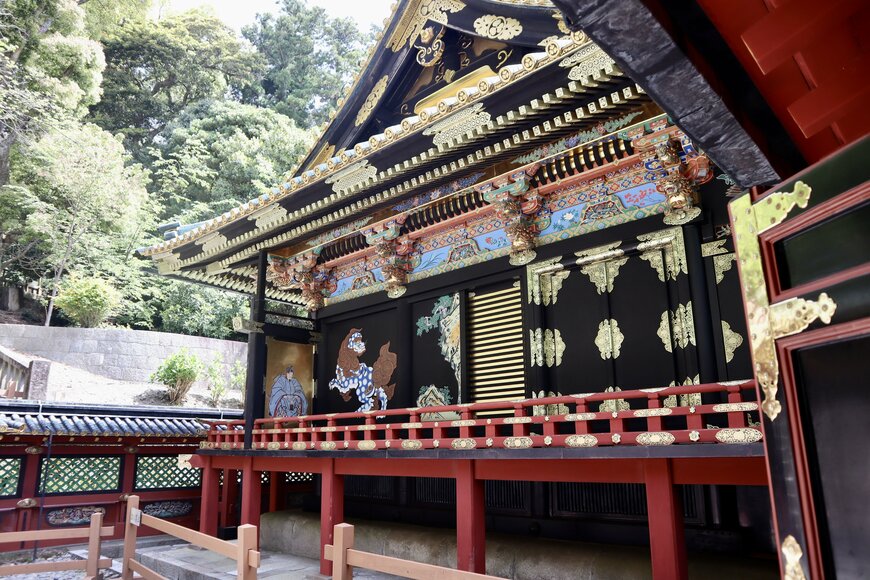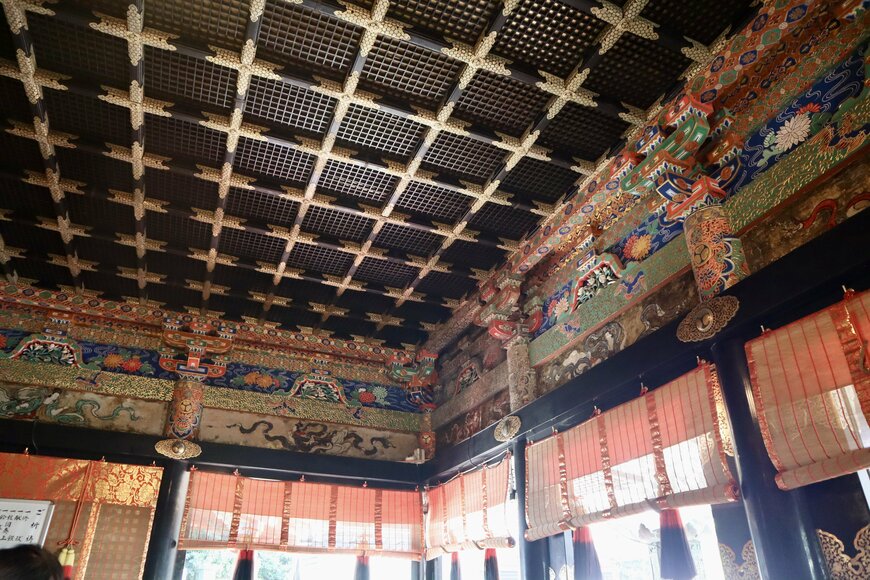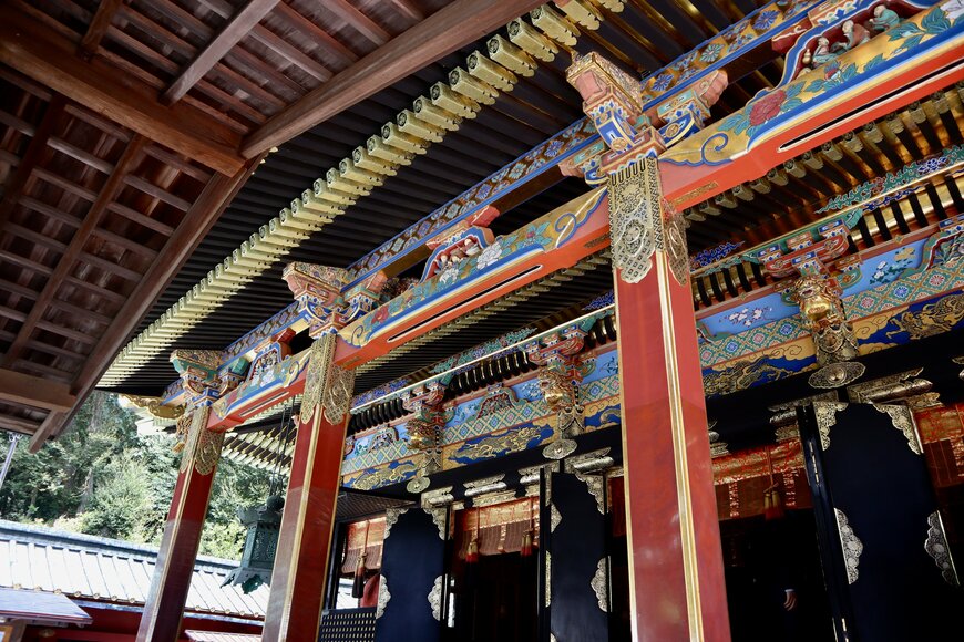 天井や柱は黒漆塗、欄間は赤漆塗で仕上げています。花や鳥などの優雅な彫刻、きらびやかな錺金具(かざりかなぐ)を用いるなど、絢爛豪華そのもの。日光東照宮よりも19年前に造られた日本で最初の東照宮とも言われています。