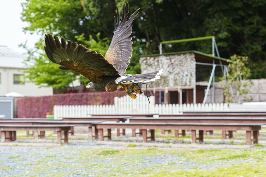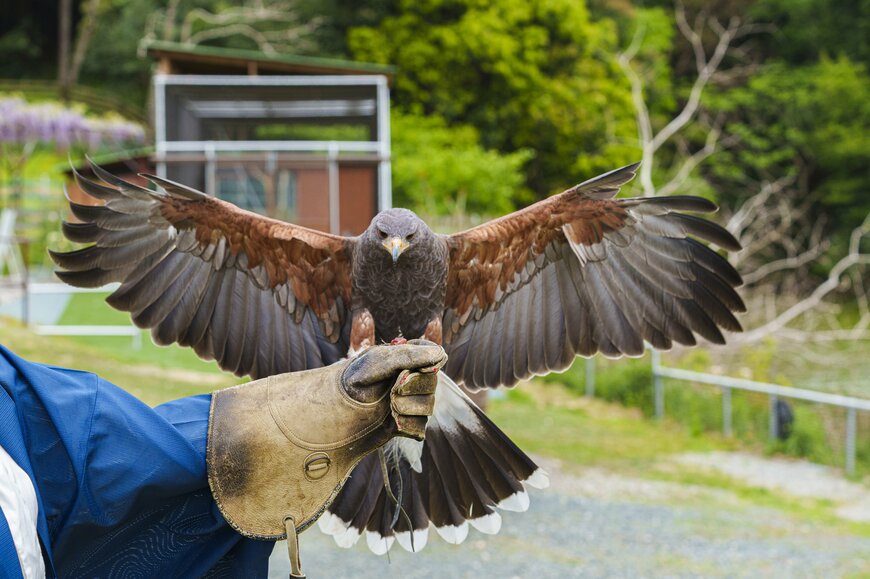 園内の屋外エリアでは、通常、猛禽類を中心とした迫力あるフライトショーが行われていますが、自分の腕に鷹が飛んでくるホークフライト体験にもチャレンジできます。