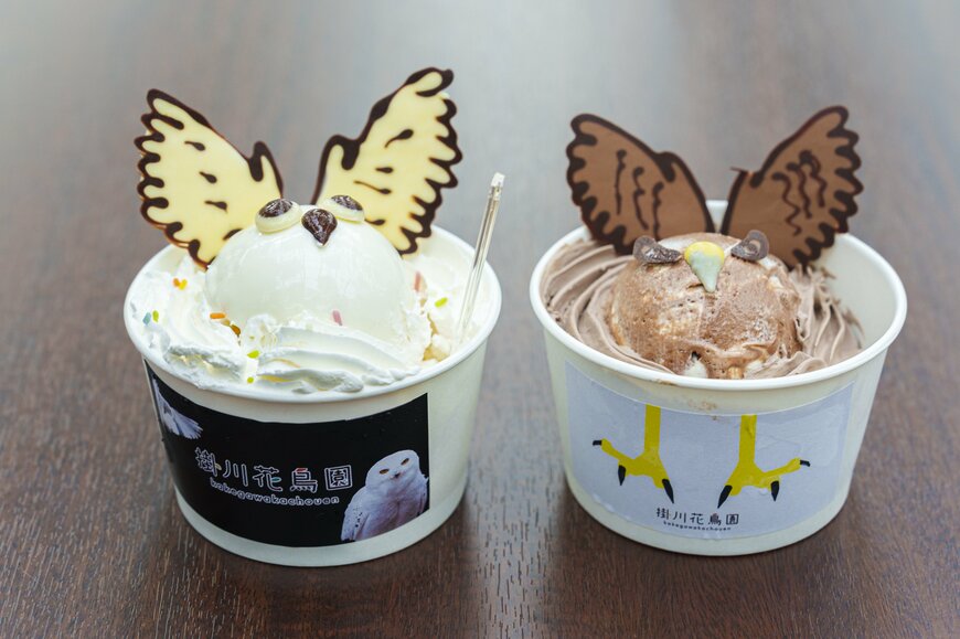歩き疲れたら園内の「カフェハナハナ」で休憩を。こちらではオリジナルスイーツとして、シロフクロウデザインのバニラアイス、鷹デザインのチョコレートアイスを販売。どちらもかわいいので両方買ってみたくなりますね。