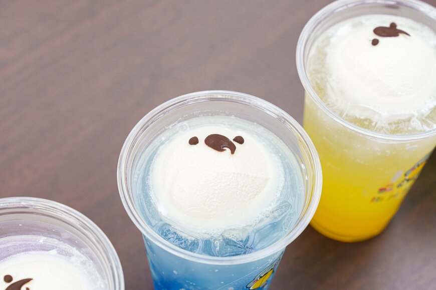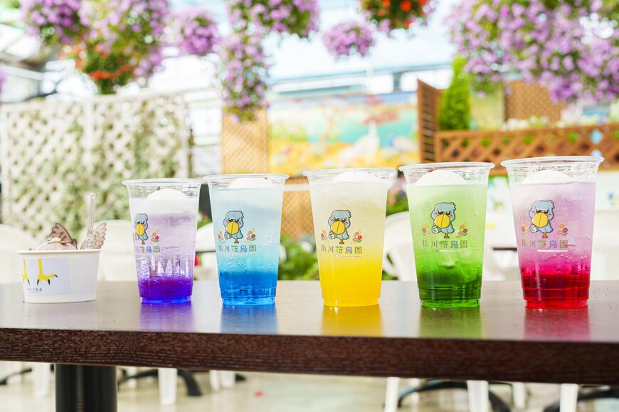カラフルな5種類のインコソーダフロートもおすすめ。コップのふたばちゃんのイラストもかわいらしいですが…、