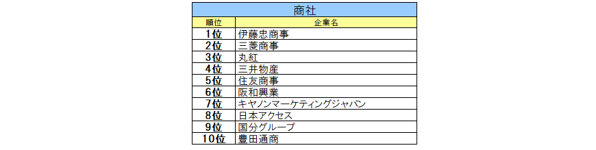 伊藤忠商事や三菱商事、丸紅など名だたる商社がランクインしました。一度は憧れた方もいるのではないでしょうか。