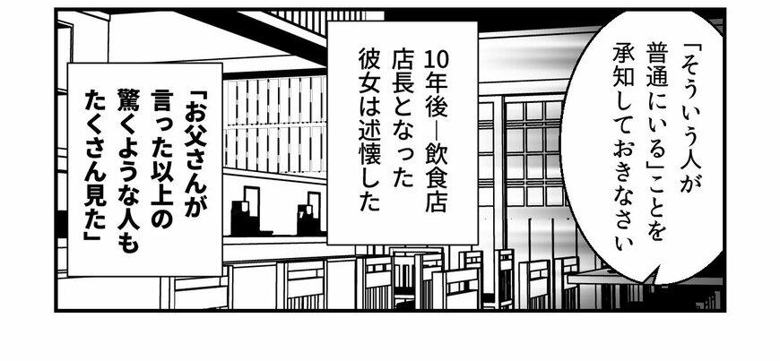 彼女はその後、飲食店の店長となり、当時の父の言葉を述懐するところで締めくくられます。