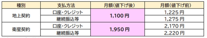 2023年10月以降は、口座振替・クレジット払いを選んだ方について、地上契約のみであれば1か月あたり125円、衛星契約であれば1か月あたり220円が値下げされます。