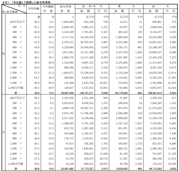 上記より、給与階級別の割合が一番多いのは「100~200万円以下」の497万635人で、全体の約2割を占めています。