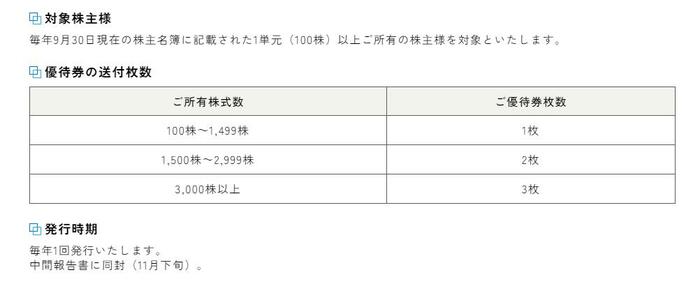 株数に応じて、3月期分は7月1日~翌6月30日までの1年間・9月期分は1月1日~12月31日の1年、10%(例外あり)の割引優待券(1クルーズ一人様2枚まで利用可能)の利用ができます。