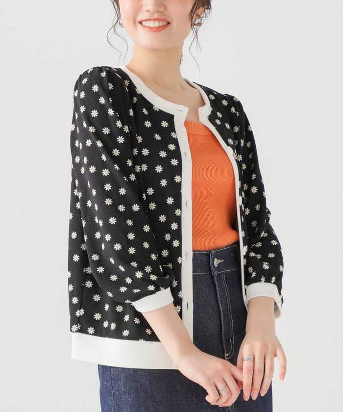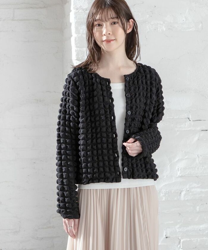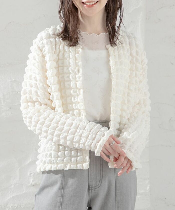 モコモコとしたトレンドのポップコーンジャカード素材を用いたカーディガンです。これ1枚を羽織るだけでとたんに雰囲気が柔和に変わります。