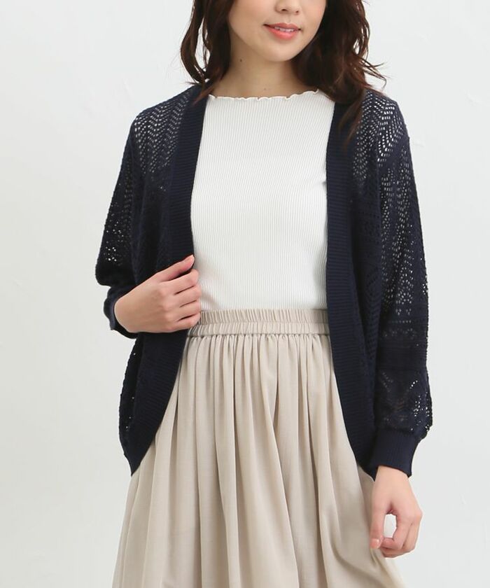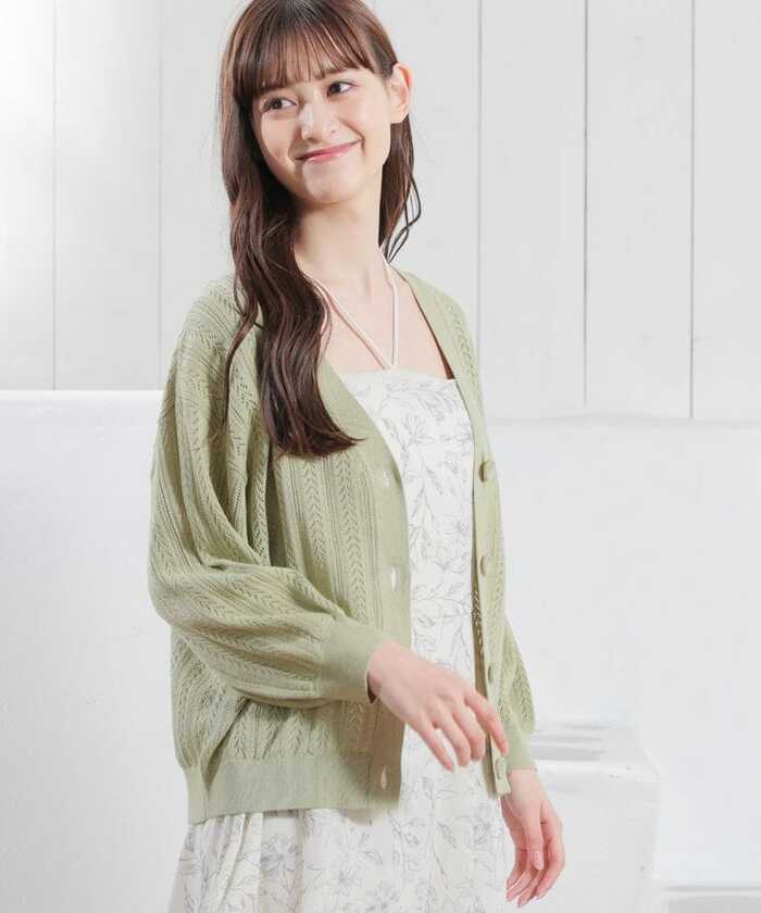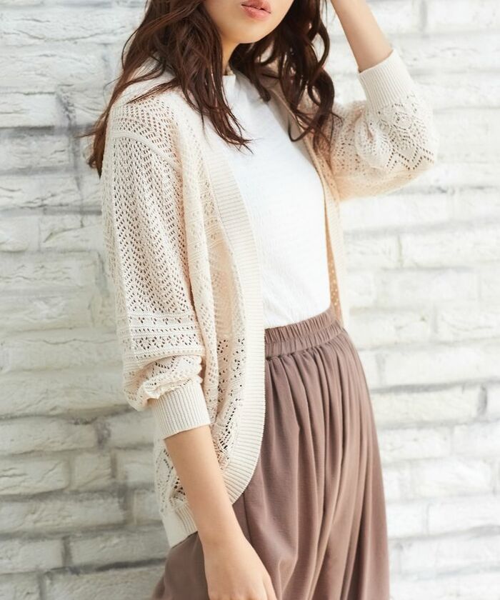 透かし編みで見るからに涼しげなカーディガンです。首元から続く柔らかな曲線が優しい印象を与えてくれます。スカートやパンツスタイルだけでなくワンピースなどにも合わせやすそうですね。