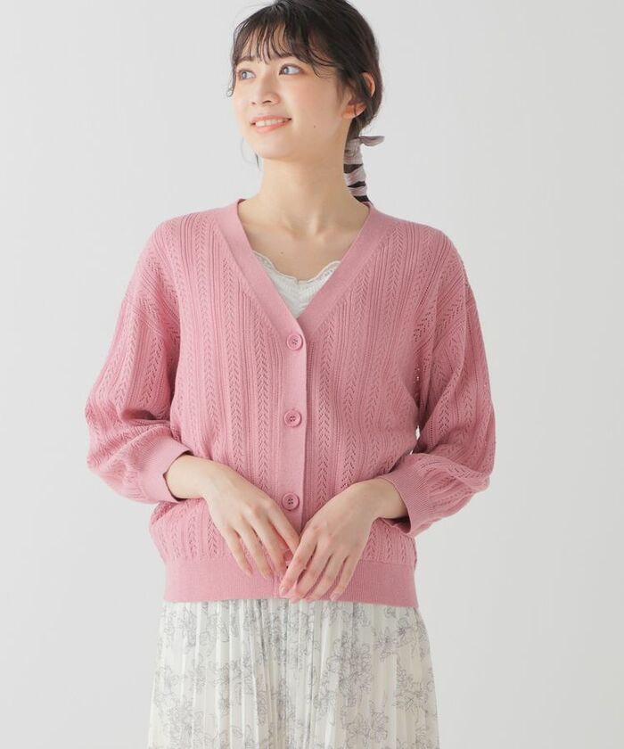 8分袖の透かし編みのカーディガンです。Vネックで胸元をすっきり見せてくれます。最近注目されている、襟の立ち上がったバンドカラーのシャツなどと合わせるのも良さそうですね。