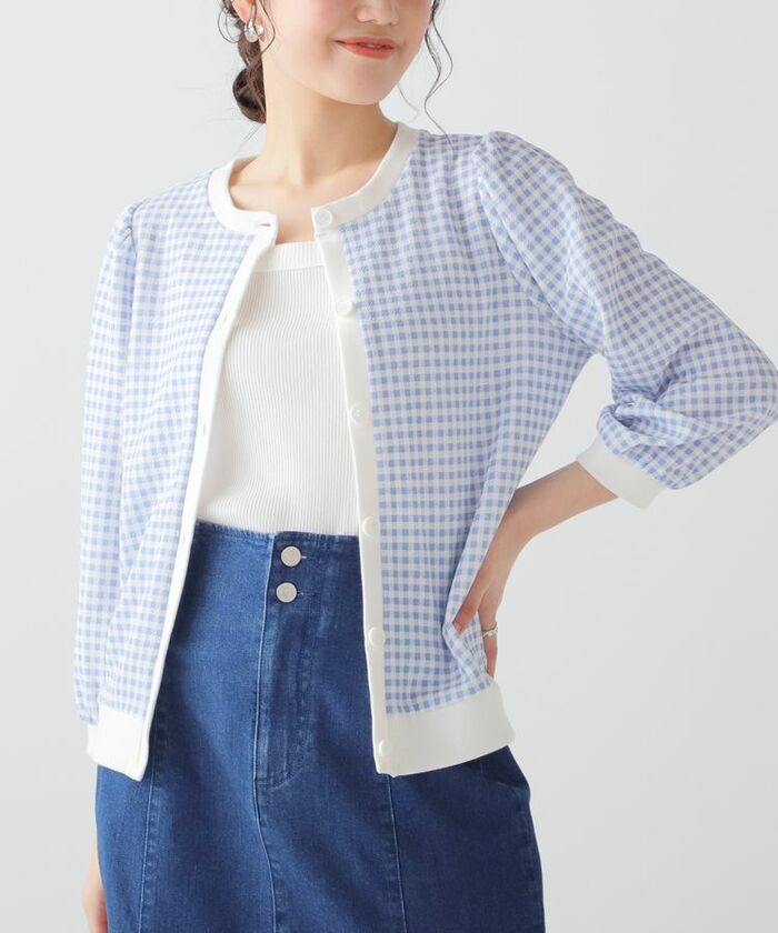 ガーリーなチェックと花柄の選べるクルーネックのカーディガンです。総柄なのでジーンズやスカートなど無地と合わせるとよく映えます。
