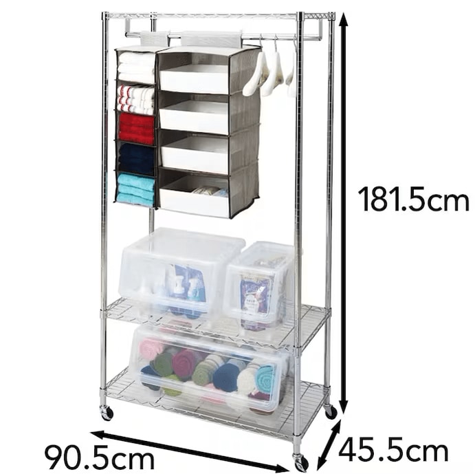 衣類をかけられるハンガーパイプのほかに、2段の収納棚がついている収納ラックです。キャスターがついているので移動が簡単です。耐荷重は、棚板1枚辺りで40kg、ハンガーは15kg、全体では100kgまでとなっています。