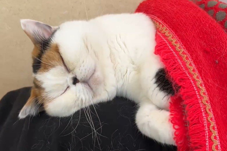 アップで見るあんみつちゃんの「フニャッ」とした表情もたまらなく愛おしいですね。そんな家族の素敵なワンシーンは大勢の心を癒したようです。