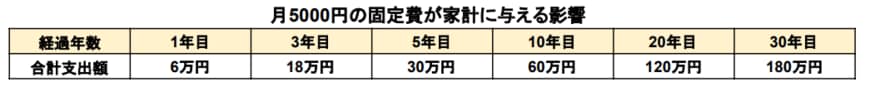 たとえば月5000円の固定費の支払いが家計に与える影響は以下のとおりです。