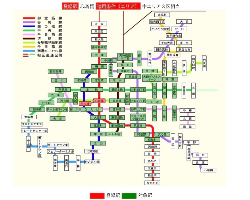 たとえば、心斎橋駅を登録駅にして、中エリア3区相当を選択すると、月の上限額は10,760円とマイスタイル(3区)より1,350円高くなりますが、御堂筋線であれば、その上限額で、昭和町駅から西中島南方駅間の乗り降りが自由になります。