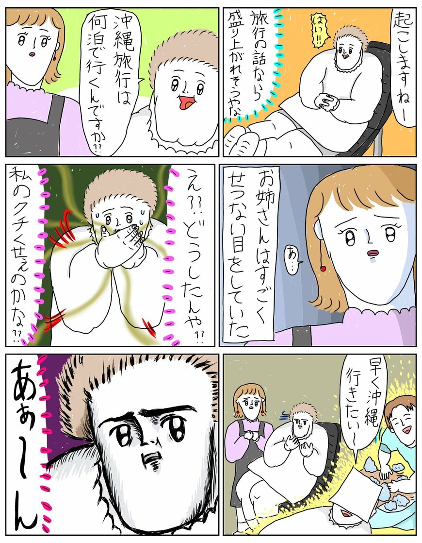 シャワーのために視界が遮られているところに、ふと聞こえた沖縄旅行の話。千載一遇のチャンスとばかりに大きな声で返答します。