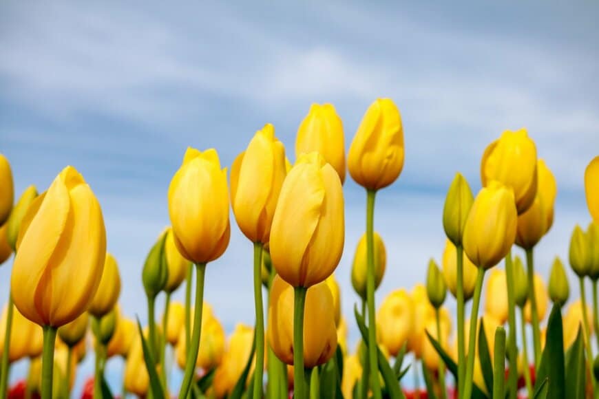 春花壇の定番花といえばチューリップ。まっすぐ伸びた茎に咲くコロンと丸い花がキュートです。