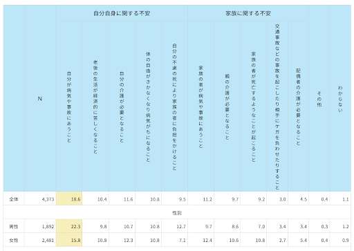 生命保険文化センターの調査によると、「自分が病気や事故にあうこと」が全体で18.6%、つづいて自分自身の老後や介護などの不安が多い結果となりました。