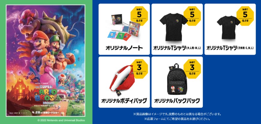 4月28日から上映される『ザ・スーパーマリオブラザーズ・ムービー』のクイズキャンペーンでは、クイズの正解者に抽選で映画オリジナルグッズをプレゼントします。クイズは誰でも参加可能。キャンペーン期間は5月18日までです。