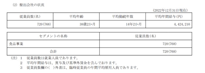 第一屋製パン(提出会社)の2022年12月末時点での従業員数、平均年齢、平均勤続年数および平均年間給与は以下の通りです。