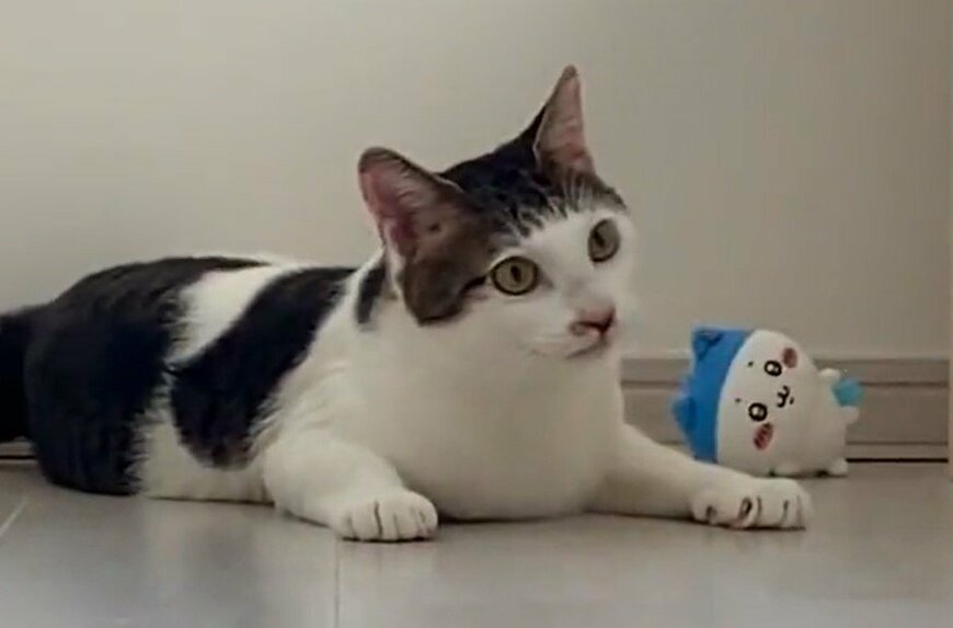 動画の終盤では、正面を向いてかわいいお顔をこちらに見せてくれたセロイくん。「スポーツ刈りのハチワレ」の隣に並ぶと、髪型のそっくりさが際立ちますね。