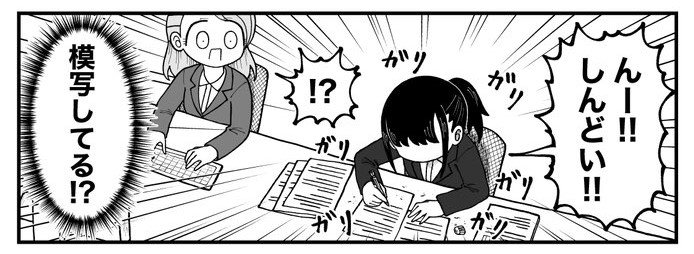そう言いながらペンを猛烈な勢いで走らせ、模写しようとする新卒ちゃん。いや、コピーってそうじゃないんだけど…と思わずツッコミを入れたくなってしまいたくなりますね。