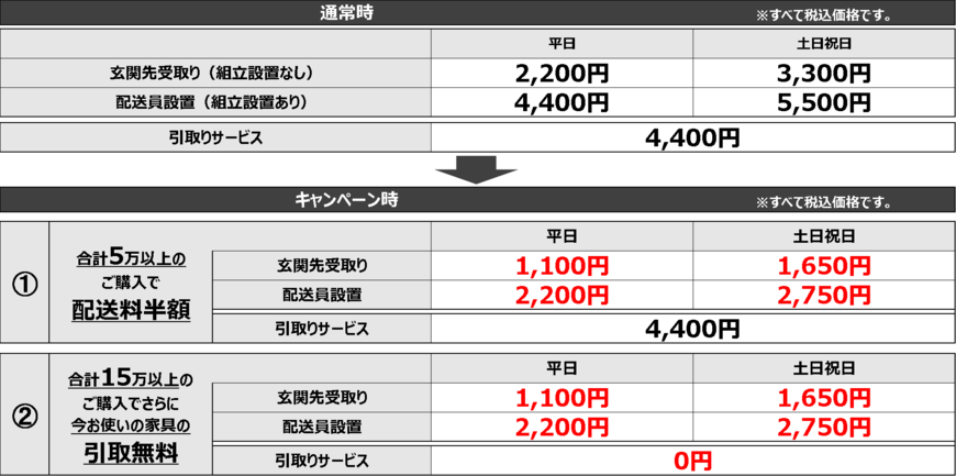 今回のキャンペーンで見逃せないのは、家具・家電の配送料半額キャンペーンを同時開催していることです。対象は組立家具、システムキッチンを除く大型家具・大型家電。合計5万円以上の購入で配送料が半額になり、合計15万円以上なら現在使用している家具・家電を無料で引き取ってくれます(引取は購入商品と同数量・同容量まで)。