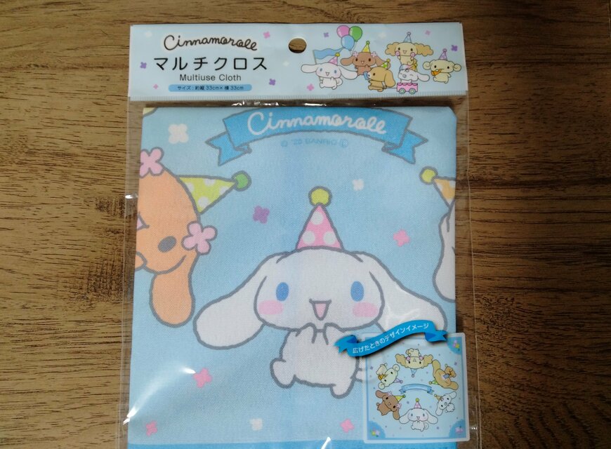 シナモンたちがかわいい「マルチクロス」です。110円(税込)のアイテムながら33cm×33cmの大判サイズとなっています。お弁当を包むのにも便利です。