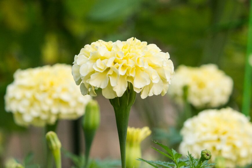 イエローやオレンジが定番のマリーゴールドですが、近年はホワイトやバニラカラーのオシャレな品種が登場しています。ホワイトガーデンには、このようなカラーをチョイスするとよいでしょう。