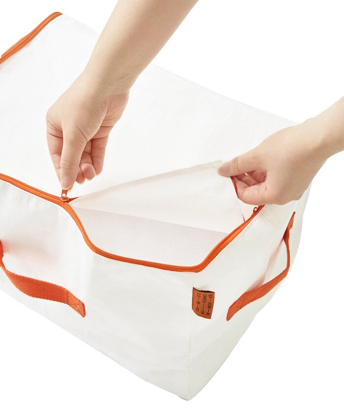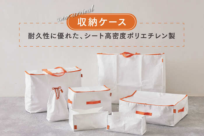 衣替えにもおすすめなこちらの収納ケース。今回登場した新作は、耐久性に優れたシート高密度ポリエチレン製なのが特徴です。どれも、シンプルなデザインにアクセントカラーのオレンジが映えています。