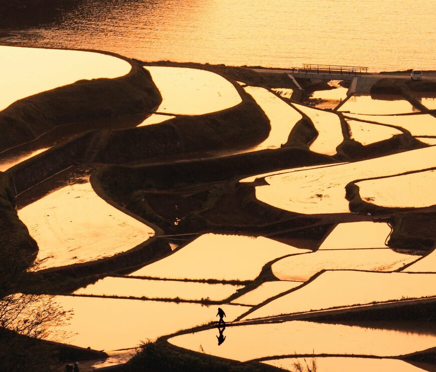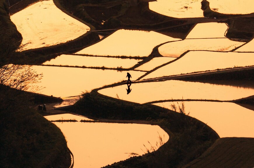 視線を惹くのは、水面に映し出された夕日の色。その中で棚田を歩く一人の人物が写し出されており、まるで絵画のような一枚に仕上がっています。じっと眺めていると写真の中に吸い込まれてしまいそうですね。