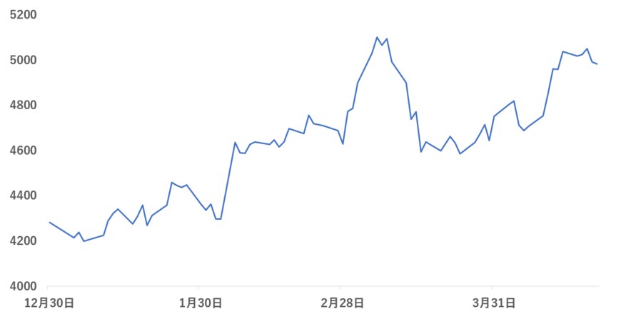 ただし、年初来高値は3月7日の5100円で、この時の2022年末からの上昇率は19.1%です。