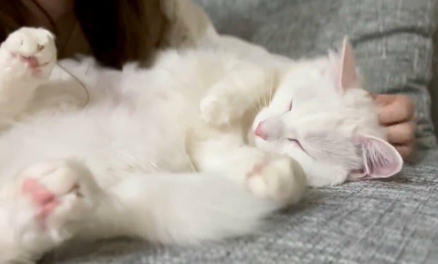 そして、優しくナデナデされると毛づくろいを止めて、目を閉じるマオくん。幸せが溢れるひとときにホッコリしますね……!