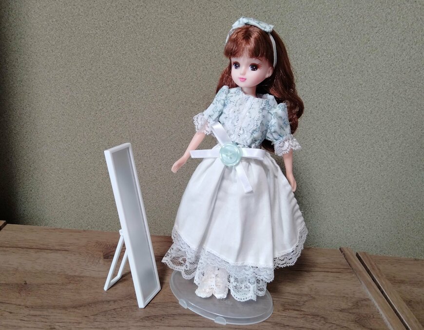 こちらはリカちゃんと並べて撮影をした写真です。鏡が腰まわりの高さになってしまうので、リカちゃんの鏡としては使えません。リカちゃんハウスのウォールミラーとしてなら使うことができそうです。