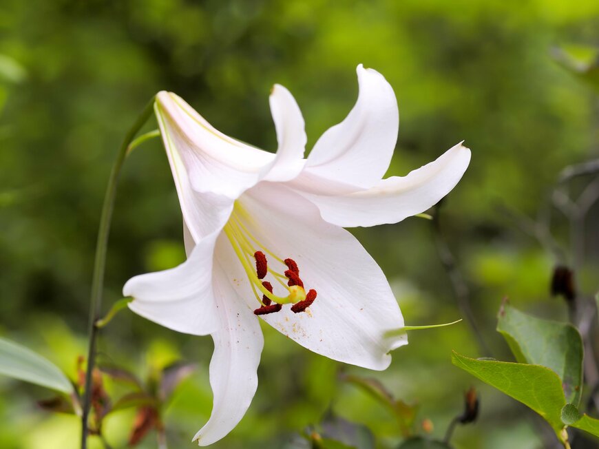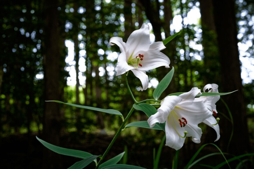 ササユリの花色はほのかに淡いピンク色。暗い森の中で咲くササユリは、そこだけスポットライトが当たったかのように明るく映えます。頬を染めてうつむきがちに咲く姿が魅力的です。