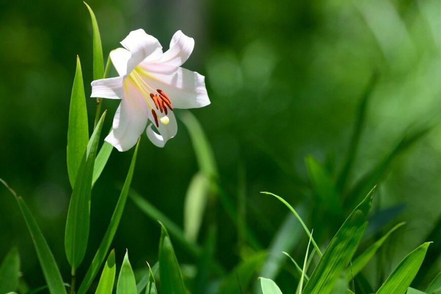 細い茎をシュッと立ち上げスタイリッシュな印象。笹の葉のようにシャープに伸びる葉も涼しげです。背丈が高いので風が吹くとユラユラと揺れる様子も楽しめます。