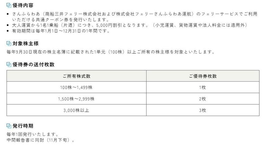 また9月期にフェリーサービス「さんふらわあ」の優待割引券も提供しています。