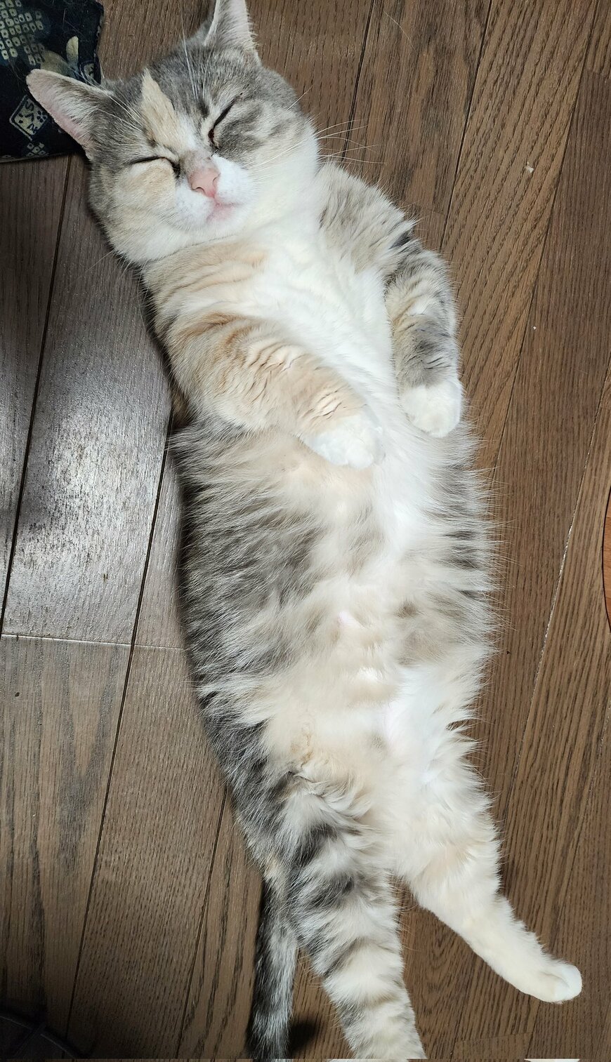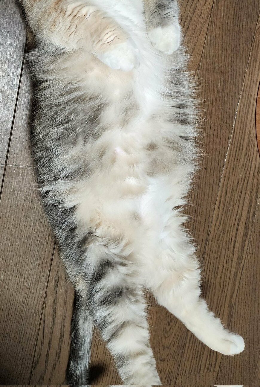 可愛いへそ天ポーズでくつろぐモフモフ猫ちゃんの写真がTwitterに投稿され注目を集めています。