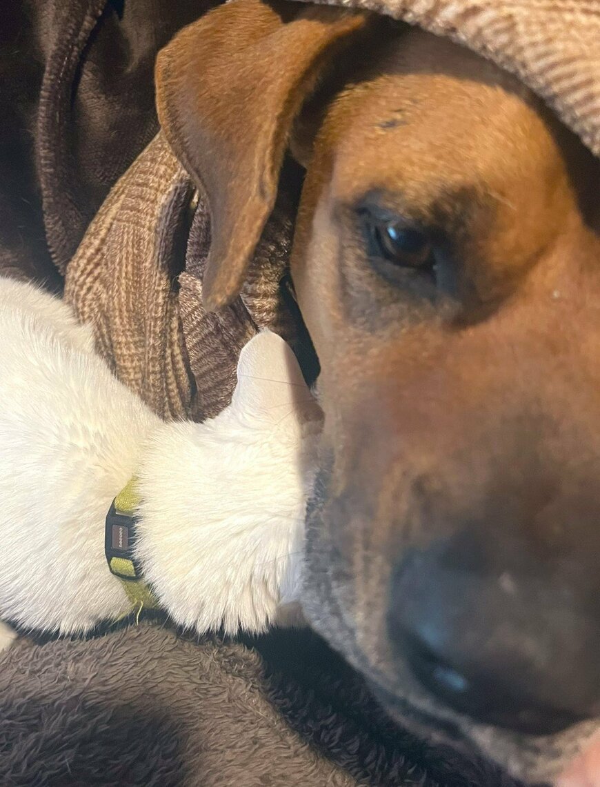 それでもワンちゃんは静かに佇んでいて、首元の猫ちゃんを優しく受け入れているのがわかりますね。そんな2匹の温かい関係性と、飼い主さんへの「大好き」が伝わる1枚は、Twitter上で大勢の心を癒したようです。