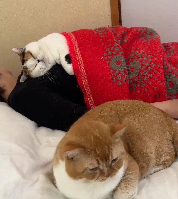 動画におさめられているのは、布団の上で横になるお母さんの姿と、その近くに集まる3匹の猫ちゃんの姿です。