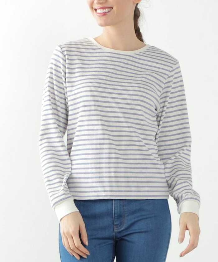 シンプルな無地とボーダーのアイテムなのでどんなコーデにもマッチします。カラーバリエーションは、「オフ」・「クロ」・「オフ×クロ」・「オフ×ベージュ」・「オフ×ブルー」の5つがあります。オンラインストアでは一部のカラーが入荷待ちとなっている人気品です。